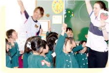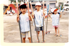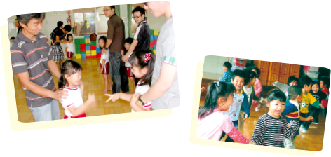 外国人専任講師による楽しい英会話遊びを行っています。大脳や聴覚の発達する幼児期だからこそ自然に英語に親しめ、外国人講師とのふれあいで国際的な感覚を育みます。